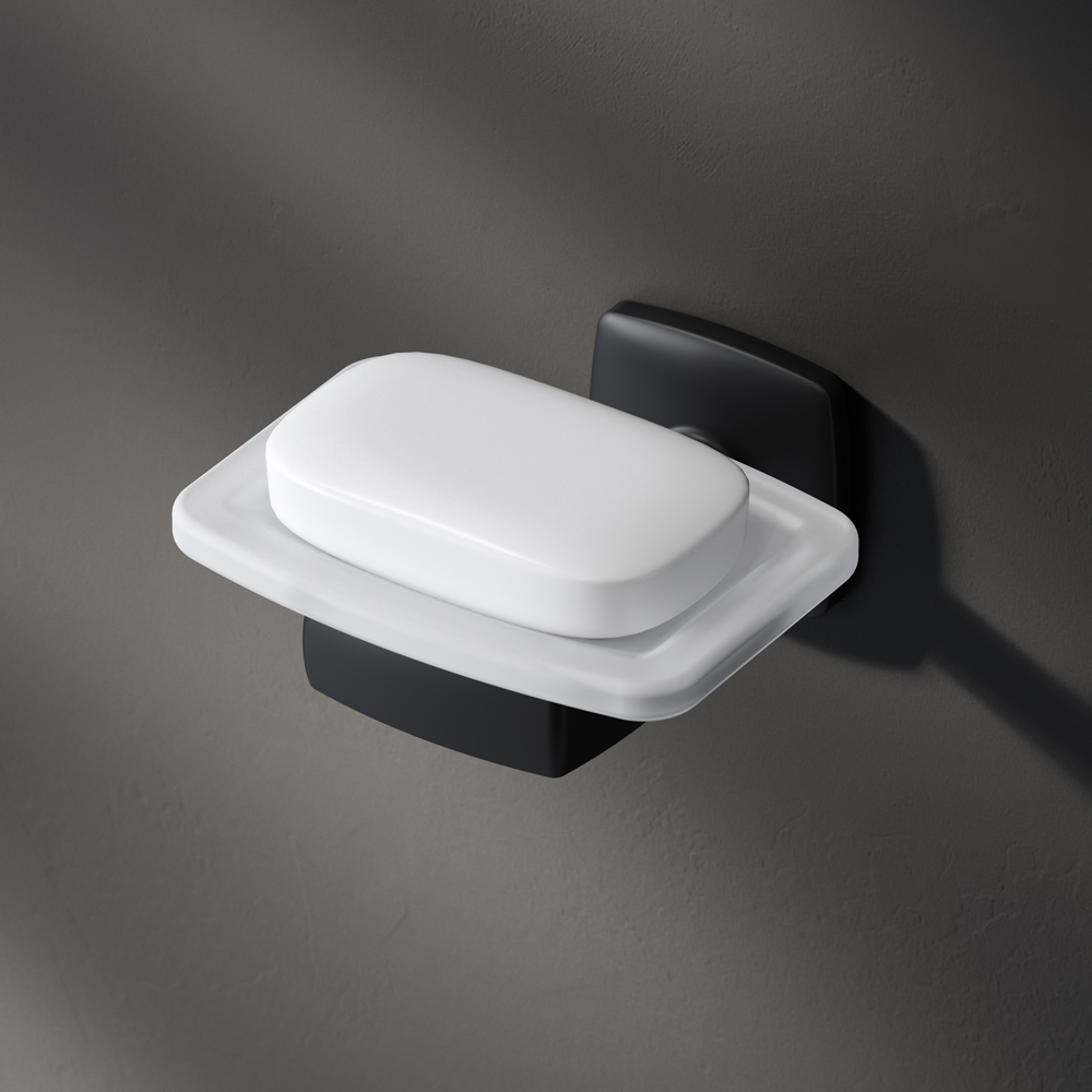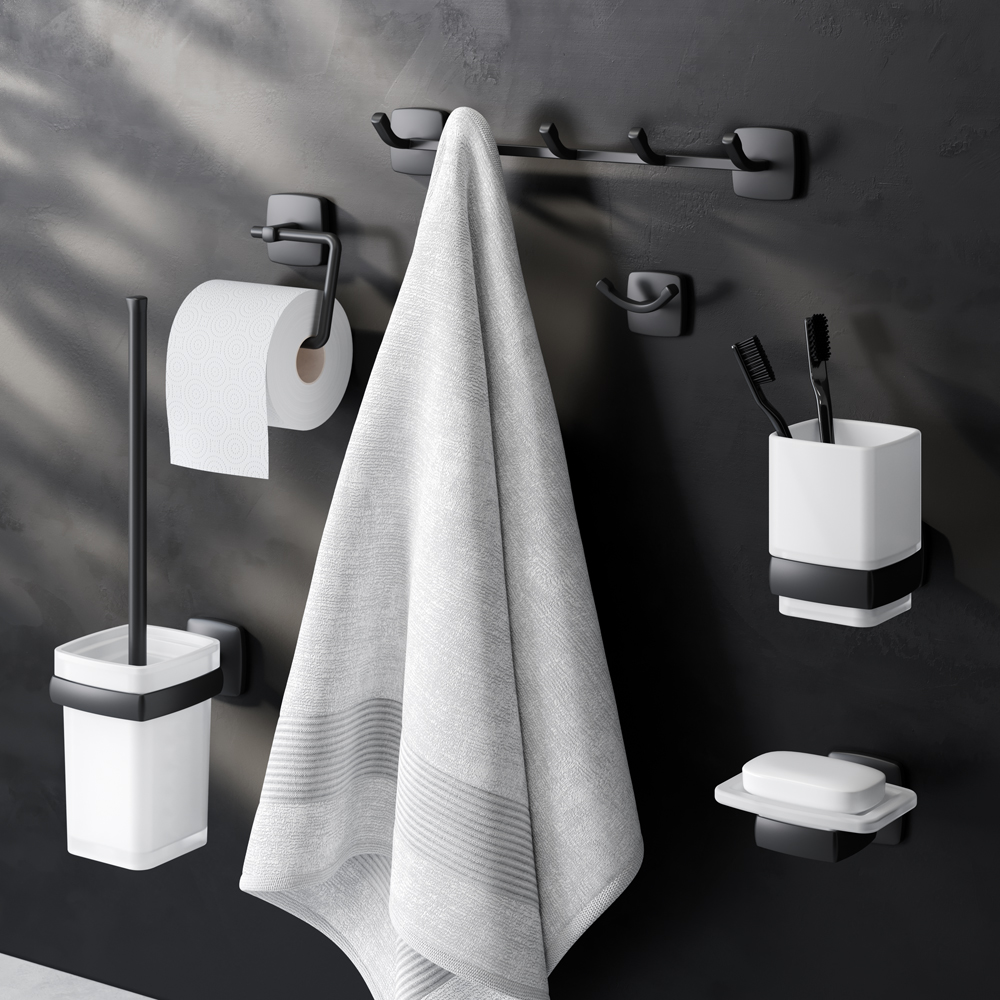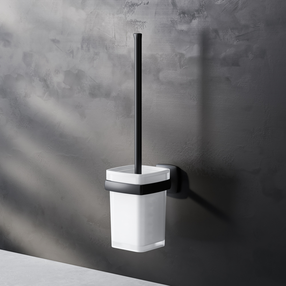 Полный набор дизайнерских аксессуаров для зоны красоты и туалета от AM.PM станет идеальным завершением образа современной ванной комнаты. Занимая минимум места в пространстве аксессуары Gem помогут рационально организовать место для хранения и станут стильными акцентами в интерьере. В комплекте: стеклянная мыльница стеклянный стакан набор крючков для полотенец двойной крючок для полотенец держатель для туалетной бумаги с крышкой стойка с туалетной щеткой. Дерзкая и стильная коллекция Gem в черном цвете превращает даже простые аксессуары для ванной комнаты в классные дизайнерские детали которыми хочется пользоваться каждый день. Форма аксессуаров повторяет линии смесителей коллекции подчеркивая единую концепцию дизайна. Премиальные детали: массивное матовое стекло прямоугольной формы. Лазерная обработка стыков – ультратонкий шов и 100% защита от влаги.