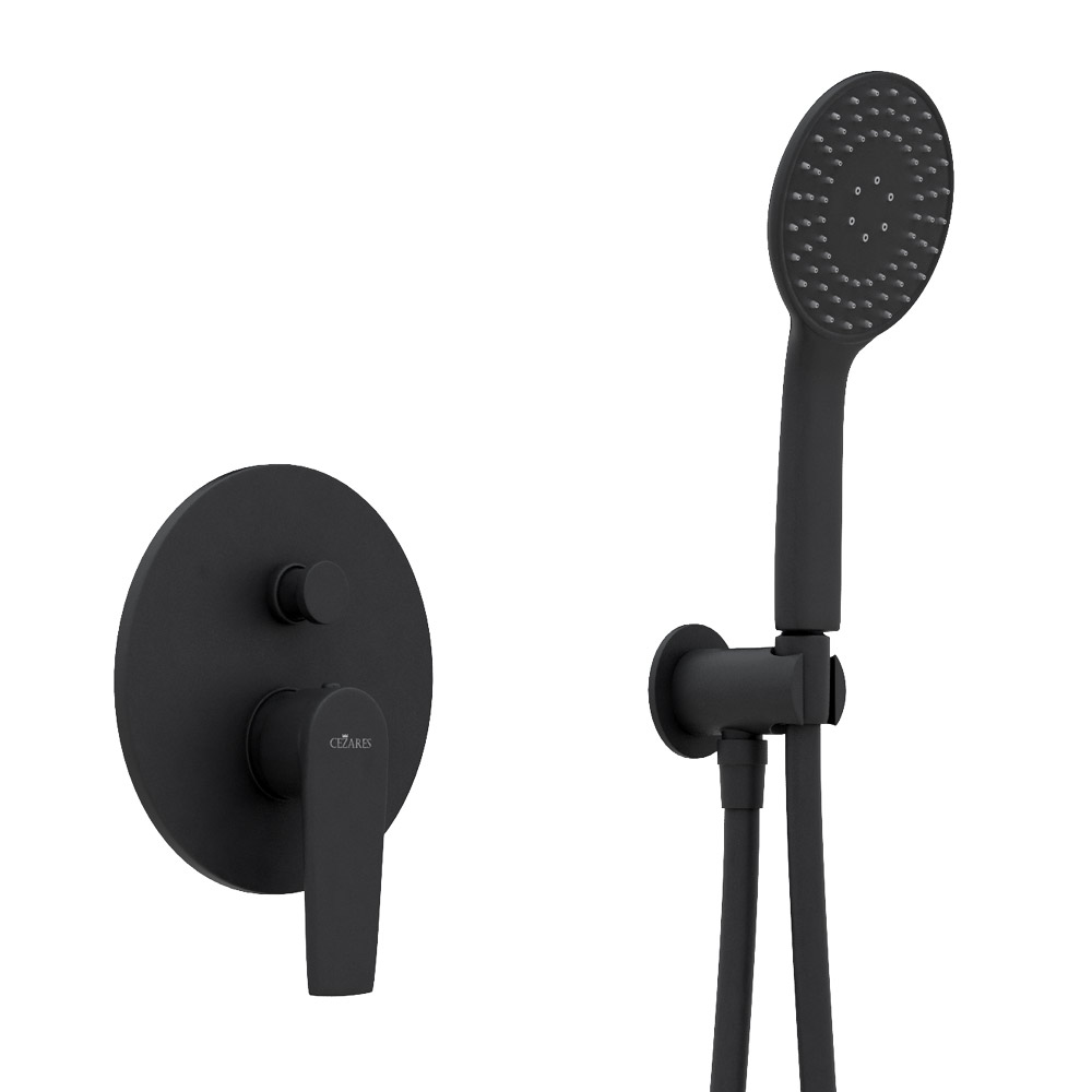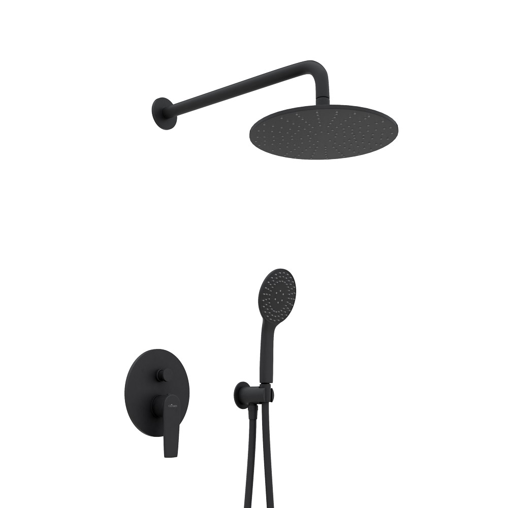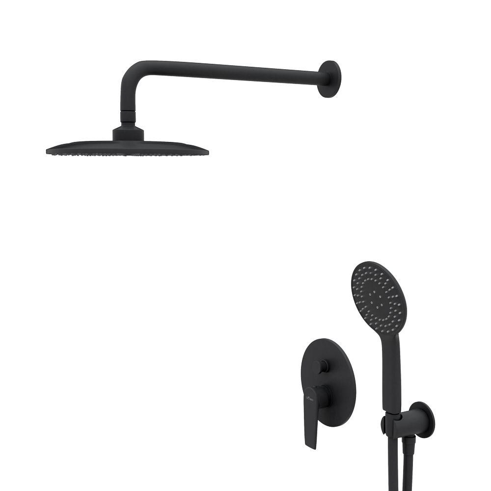 Комплект оснащен одним смесителем с рычажным управлением, что обеспечивает удобство и простоту использования. В комплекте также имеется шланг, лейка, подключение для душевого шланга с держателем, верхний душ и скрытая монтажная часть.