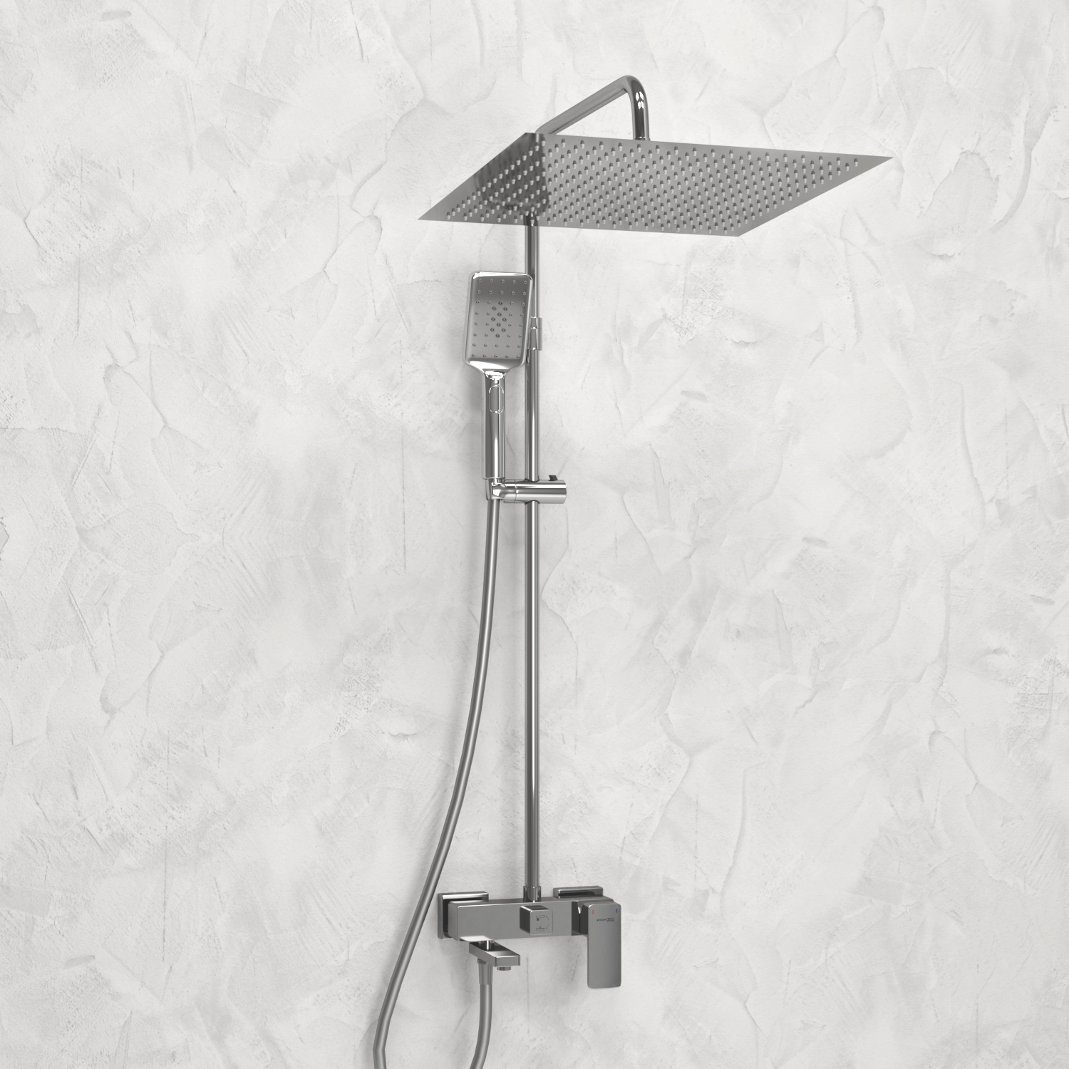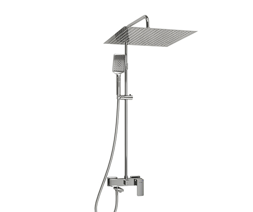 Душевой комплект оснащен квадратным верхним душем, который обеспечивает равномерное распределение воды. Высота стойки для душа составляет 113 см, что позволяет комфортно принимать душ даже высоким людям.