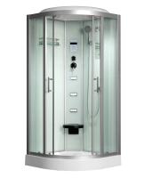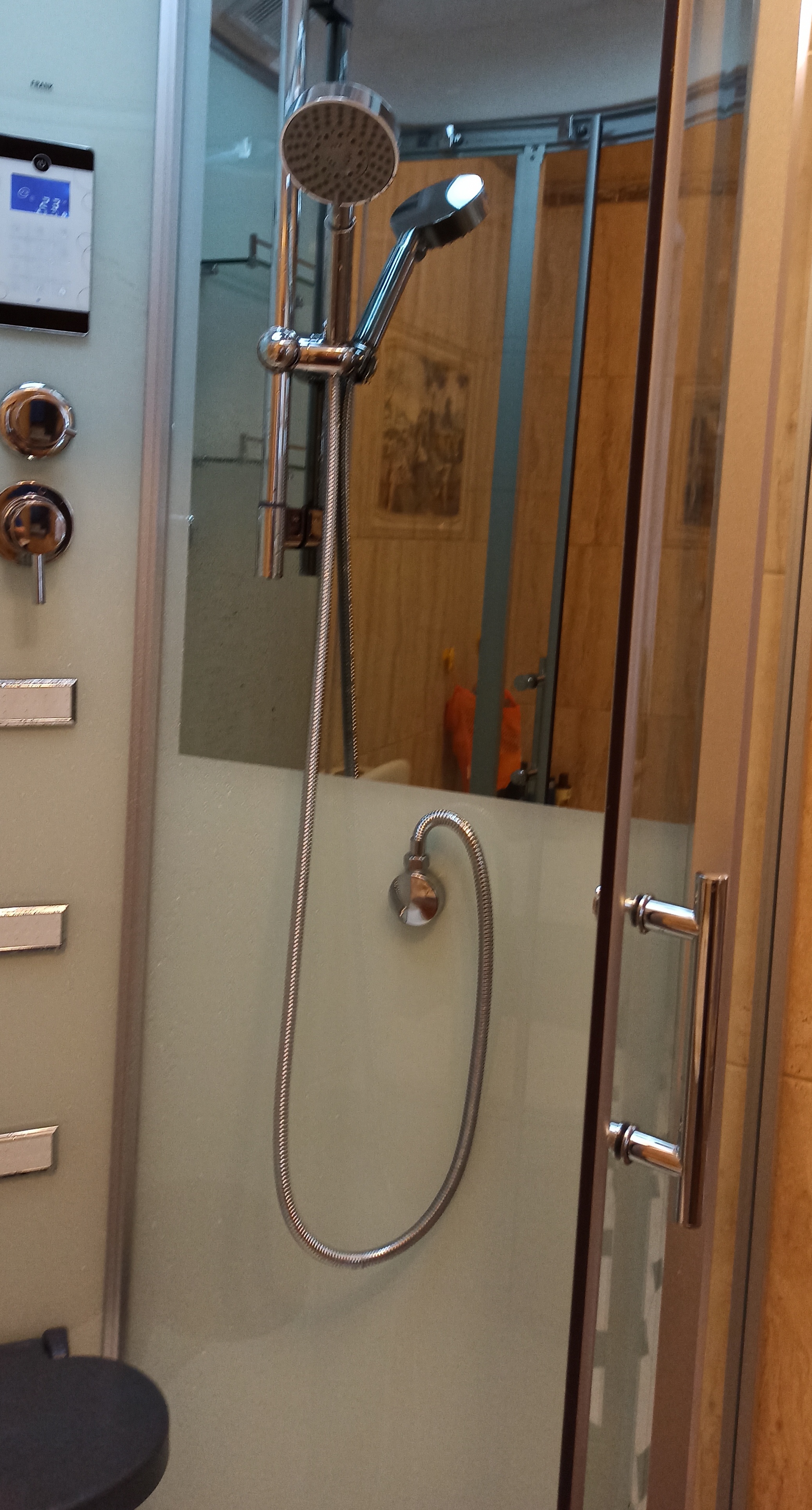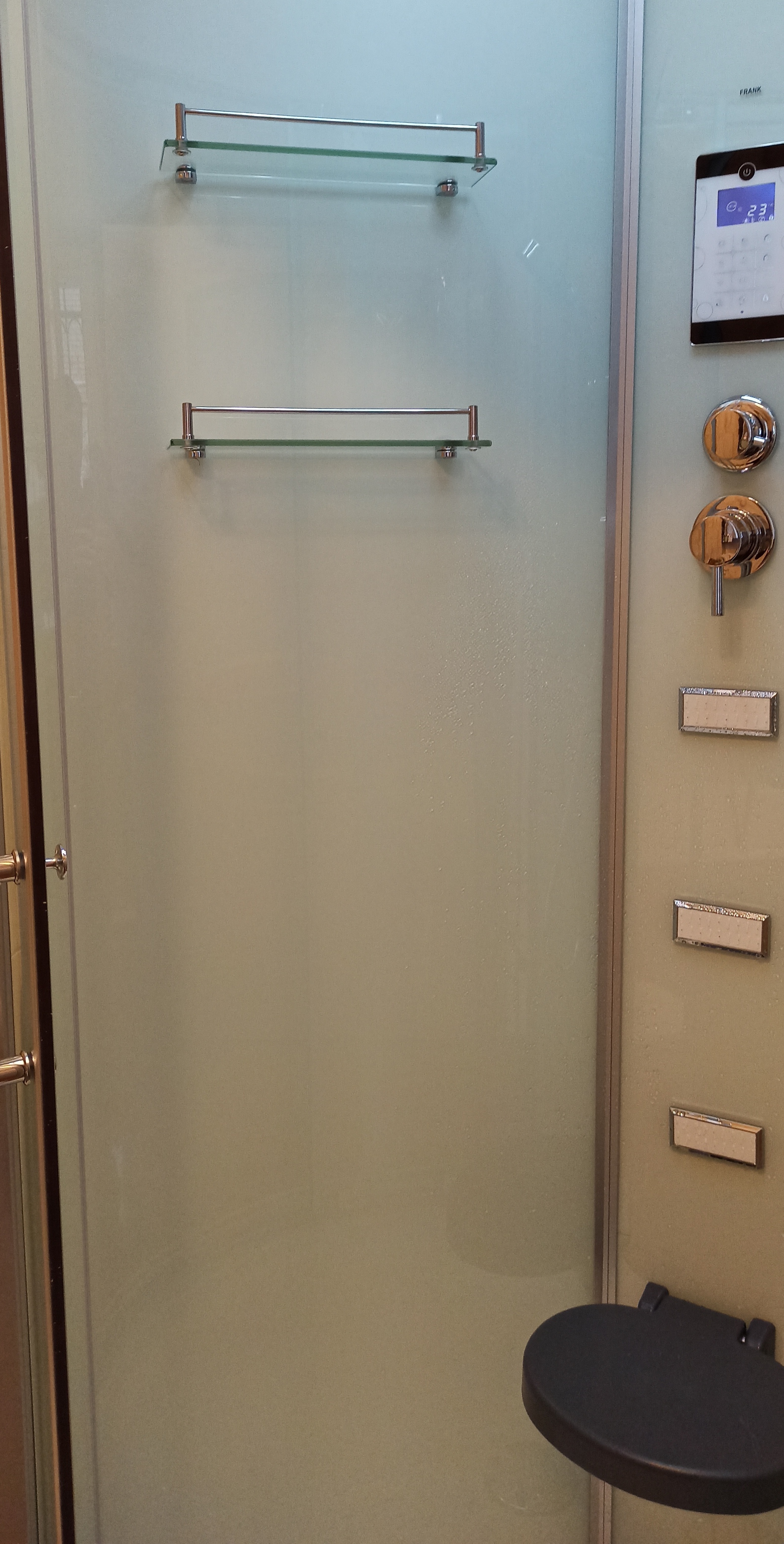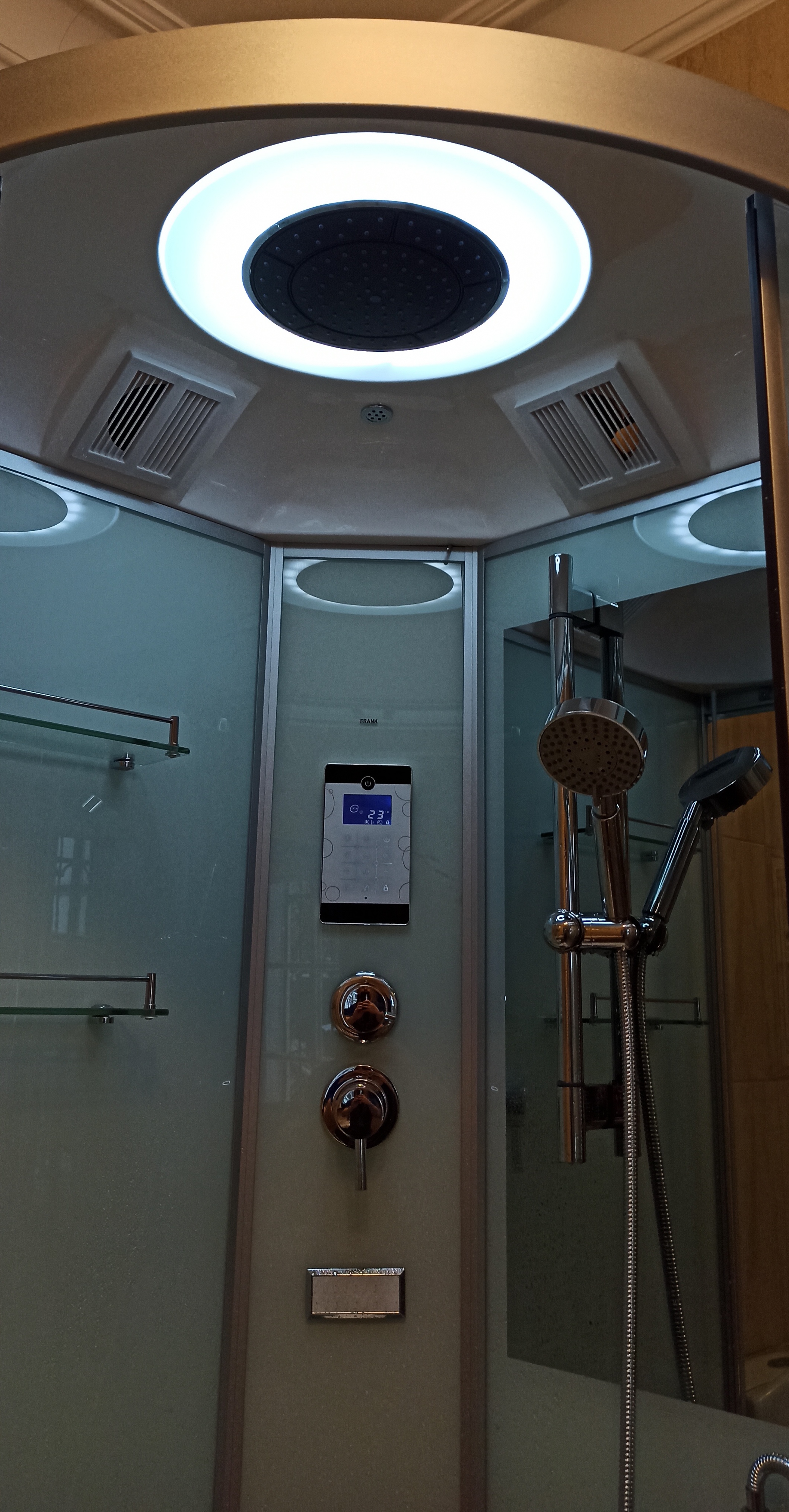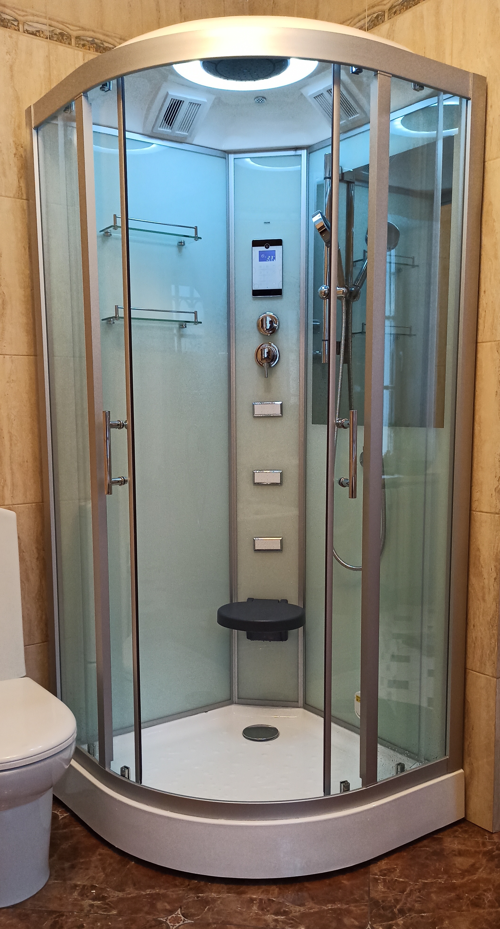 Поддон кабины усилен металлическим каркасом на регулируемых опорах и выдерживает нагрузку до 300 кг. На стенках и центральной стойке, расположились: переключатель и смеситель с керамическим картриджем, сенсерный пульт управления, ручная лейка с самоочищающимися резиновыми джетами, три форсунки гидромассажа, зеркало, сидение в поддоне и просторная полочка для шампуней и гелей. А на крыше, нашёл себе место, широкий тропический душ, диодная лампа, вентилятор и динамик под FM радио.