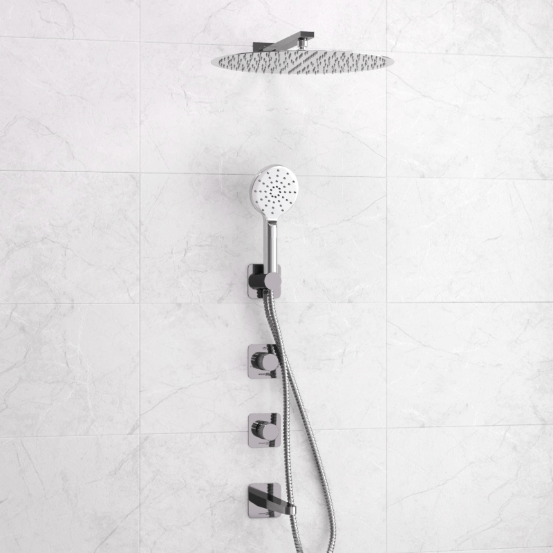 Монтаж комплекта встраиваемый, что позволяет скрыть все элементы системы в стене, сохраняя при этом эстетику ванной комнаты.