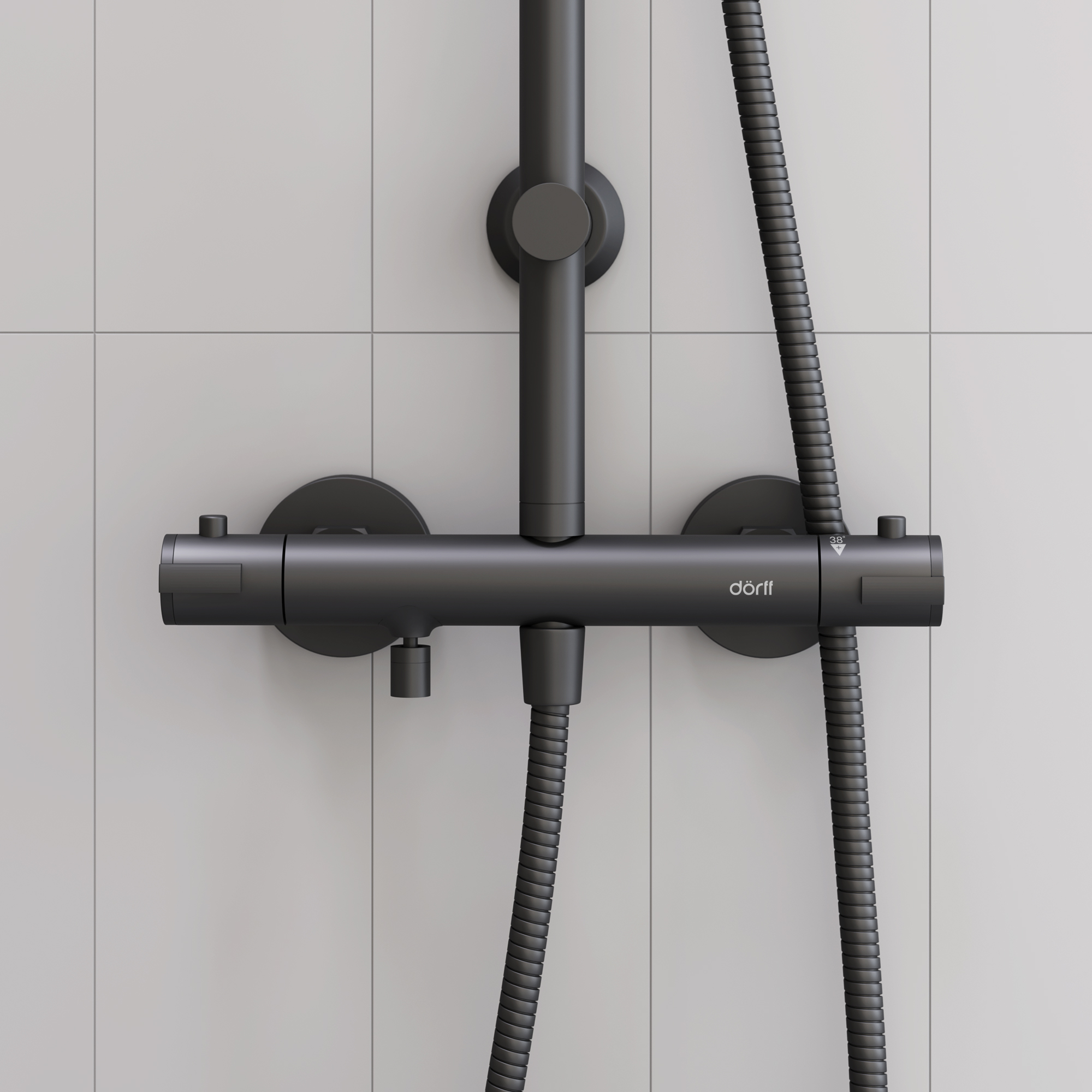 Выгода в комплекте! Душевая система и смеситель для ванны и душа c термостатом по привлекательной цене. Душевая система Futura с тропическим душем ручным душем с 3 функциями и длинным шлангом в 1500 мм - просто находка в своем сегменте. А стойка с возможностью регулировки по высоте станет приятным бонусом для тех кто ценит эргономичность и функциональность. Термостат душевых систем в элегантных современных размерах предотвратит от ожогов даже при внезапном отключении холодной воды. Встроенный стопор безопасности на 38 градусов. Продукт собрал в себе лучшие немецкие качества: стильный дизайн продуманный размер технологичность европейское качество прочность и долговечность. Убедитесь сами: DORFF - сделано на совесть! ""