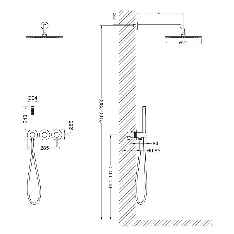 - Диаметр верхнего душа: 300 мм.
