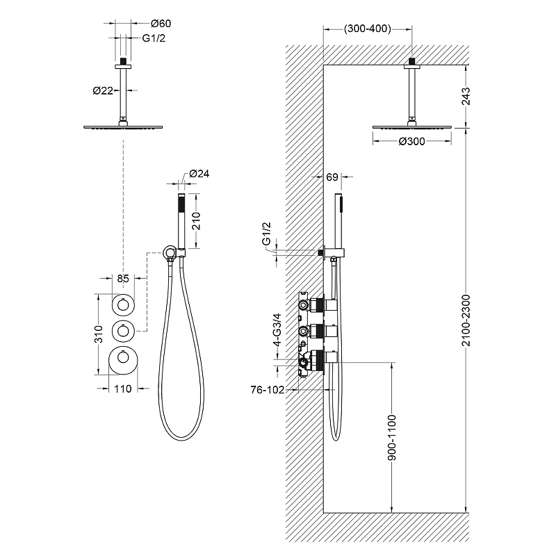 - Диаметр верхнего душа: 300 мм.