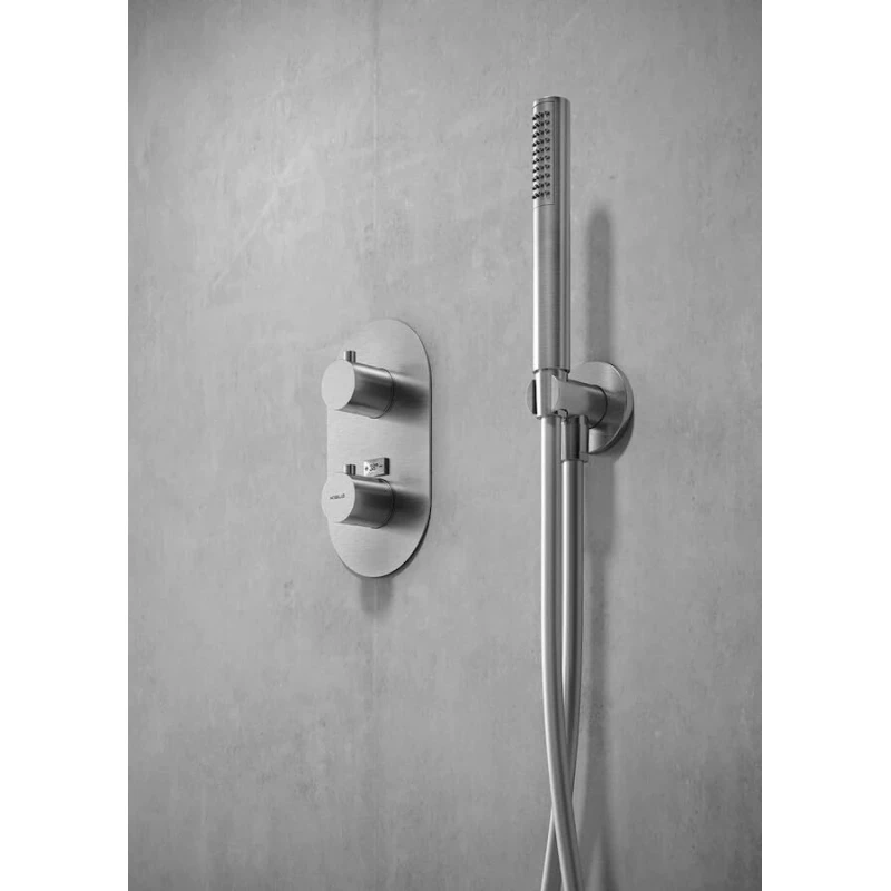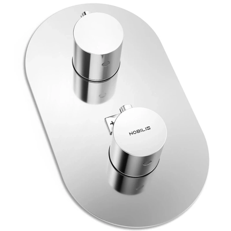 Термостат "Nobili Live" имеет корпус из латуни, покрытый нержавеющей сталью, что обеспечивает его долговечность и устойчивость к коррозии.