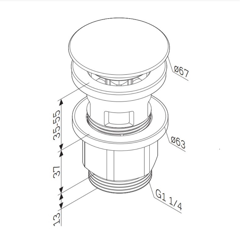 С отверстием для подключения перелива позволяющего выпускать воду из раковины при ее переполнении через отверстие в нижней части перелива. Система клик-клак управляется нажатием на пробку слива. Покрытие устойчиво к коррозии появлению царапин сколов и потускнению. Круглая заглушка черного матового цвета. Подключение к сифону: G1 1/4